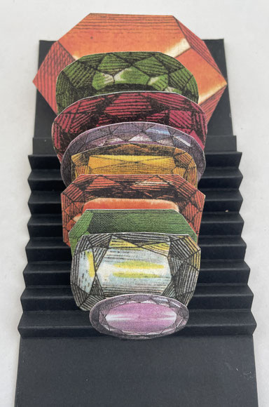 Eight gentleladies peek out from the pages of this book. Six pages are made from mat board and two are dioramas. One of a kind.