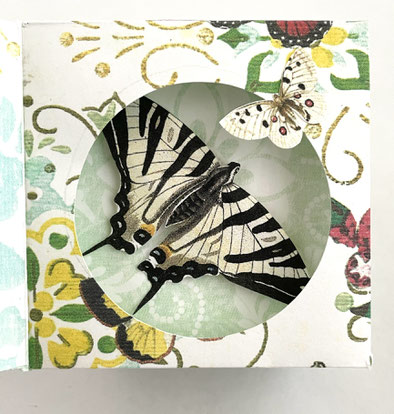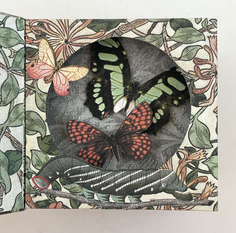 Each page of this book is a shadowbox made using Willaim Morris' patterns and colorful butterflies. One of a kind. Measures 3" by 3" by 2 1/2".