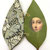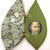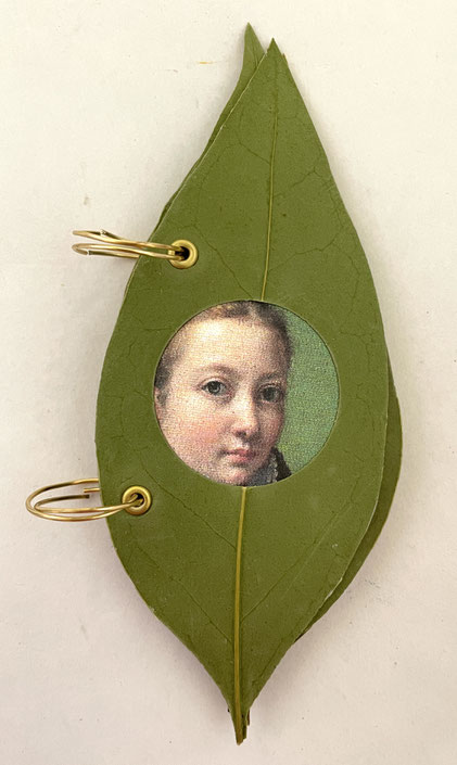 I made circular openings in these dried, pressed leaves and inserted portraits of gentleladies of long ago. Measures 5" by 2 1/2".