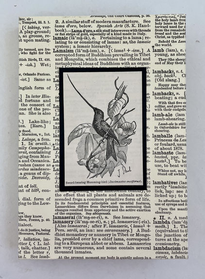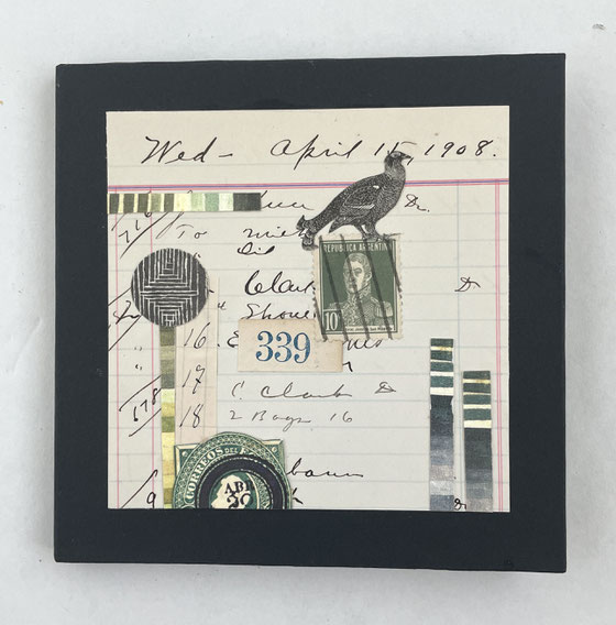 I used pages from a 1908 ledger to create collages using old postage stamps, encyclopedia images and odd bits of paper. One of a kind.