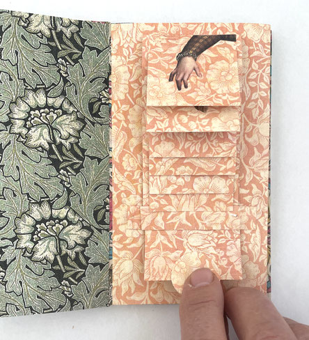 When you pull down on the tab a series of panels flip up back and under. When you push back up on the tab the reverse back into place. Book measures 3 1/2" by 6". One of a kind.