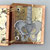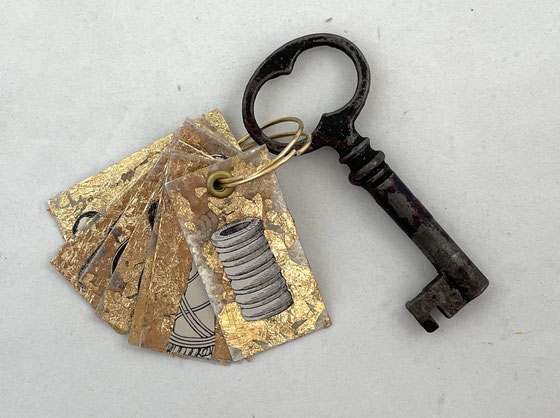The eight pages of this book are mica enhanced with gold leaf. They hang from a brass jump ring attached to a skeleton key. One of a kind.