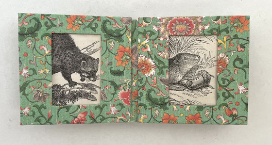 Four matchboxes are sandwiched between two covers. Each matchbox contains a minibook with cute animals. One of a kind.