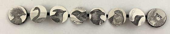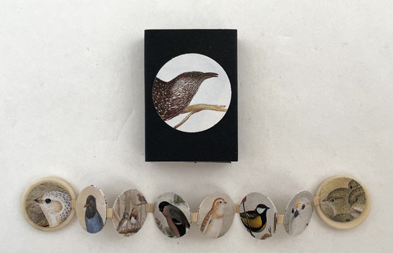 The covers of this book are vintage buttons. Eight bird species are depicted on the page of the book. Comes in its own matchbox. One of a kind. Book measures 3/4" in diameter.