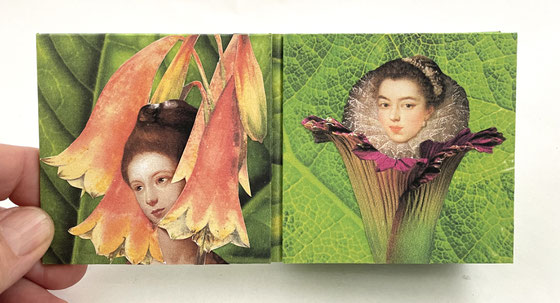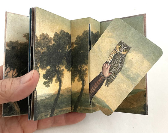 This tunnel book is a new take on Da Vinci's famous portrait. The tunnel can be flattened to the left or right, or displayed on a shelf so you can appreciate her bird-enhanced portrait. One of a kind. Measures 3 3/4" by 4 1/2" by 2".