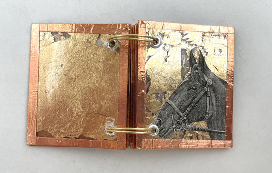 The pages of this book are made with mica enhanced with gold leaf. I framed each page with copper tape and. made the jump rings from brass wire. One of a kind. Measures 1 5/8" by 2".