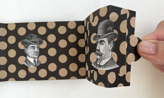 When you open this accordion book a parade of dapper dudes greets you. Measures 1 5/8" by 2".