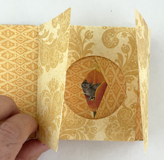 When you open the doors on each page shutters slide open to reveal tiny mice peeking out between tulip petals. One of a kind. Measures 4" by 4".
