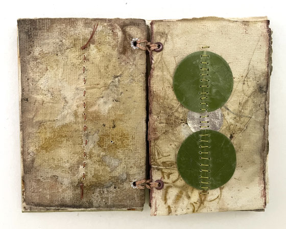 The pages of this book are eco-dyed paper. I enhanced the book with bits of leaves and bark, hand-stitched onto the pages. One of a kind.
