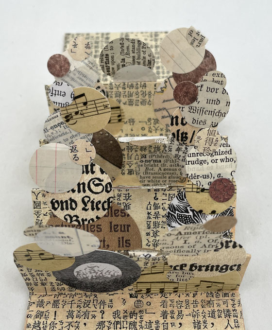 Bouncing circles punched from old papers and ephemera adorn this flag bok. One of a kind. Measures 2 1/2" by 3".
