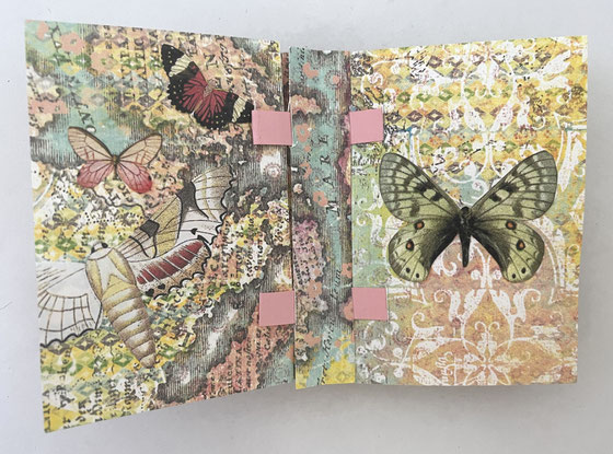 This book is bound with two long strips of paper---no glue was used. A variety of butterflies are collaged onto the pages. One of a kind.